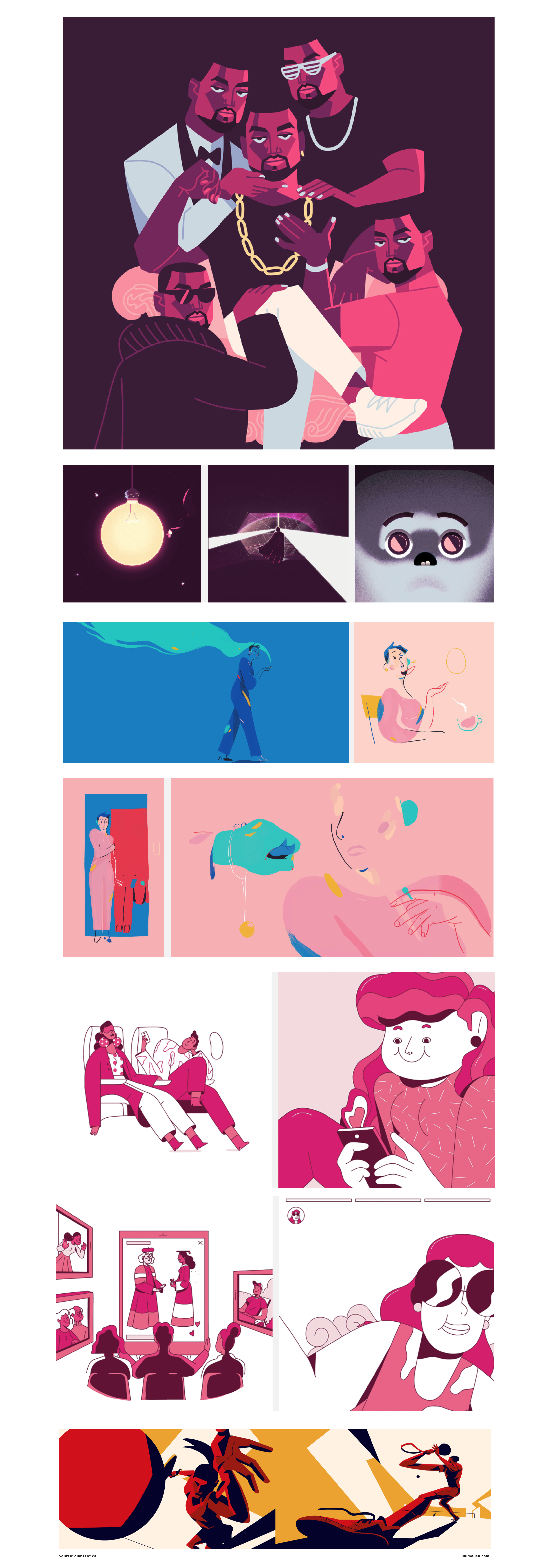 الأول: لـ رفاييل مياني، من محترفي الإلستريشن العالميين .. تأمل الفراغات في مشاهده، حتى في المشهد الذي تطلب خلفية كاملة (الوردي) .. كانت نسبة الفراغ موزنة، فلا تشعر بأن المشهد العام مُكدّس، ولا بأن الجزء المُمتلئ منه (الرفوف) متروسةً بالمنتجات … تأمل الفراغات بين المنتجات .. وطريقة تلوين بعض المنتجات بلون مماثل للخلفية ما أضاف شعورًا ذكيًا بعدم الإمتلاء.