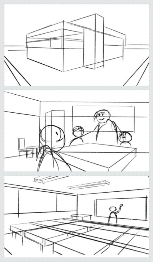 وهنا أخذنا قرار لحسم هالتباين بإننا نعيد النظر في الأنماتكس ككل، ونخرج بستوري بورد سريع نلم فيه الافكار بعد التبسيط اضافة لربط موضوع انتقالات الظلال اللي مافكرنا فيه من البداية